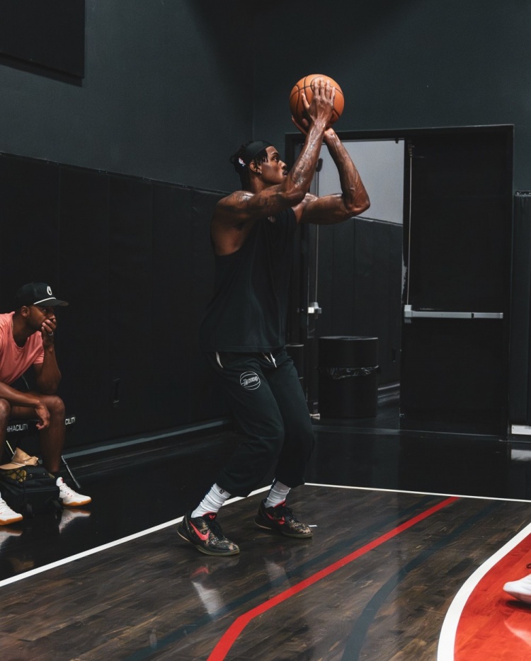 在球场训练中,范德比尔特主要练习三分投射,尤其是两个底角的跑动接球投篮。